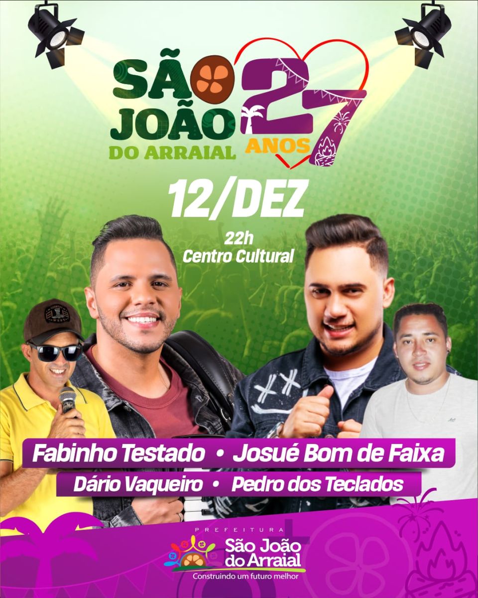 Na terça-feira (12), a Prefeitura de São João do Arraial irá promover, no Centro Cultural, um evento musical com atrações locais e artistas nacionalmente conhecidos. O show, que terá início a partir das 22h, faz parte da programação especial em alusão aos 27 anos do município. Na ocasião, o público poderá desfrutar de performances musicais variadas, incluindo os shows de Josué Bom de Faixa, Fabinho Testado, Dário Vaqueiro e Pedro dos Teclados. A prefeita Vilma Lima expressa o entusiasmo ao falar sobre a festividade. "Estou muito ansiosa por esse momento de celebração que vai trazer muita alegria para o povo sanjoanense. É uma honra poder proporcionar à nossa população essa programação diversificada, marcada por atrações nacionais e talentosos artistas locais. Espero que todos participem e desfrutem dessa festa que é feita com carinho para celebrar o aniversário da nossa querida cidade", finaliza.